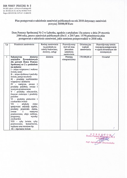 Plan postępowań o udzielenie zamówień publicznych na rok 2018 dla DPS Nr 2 w Lęborku powyżej 30000 E